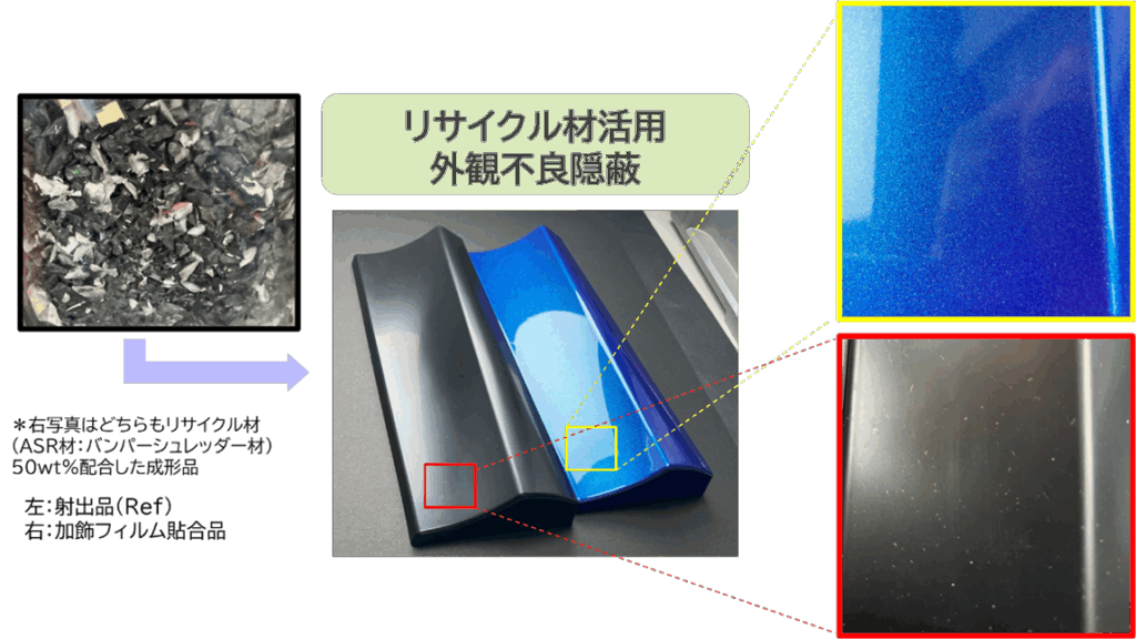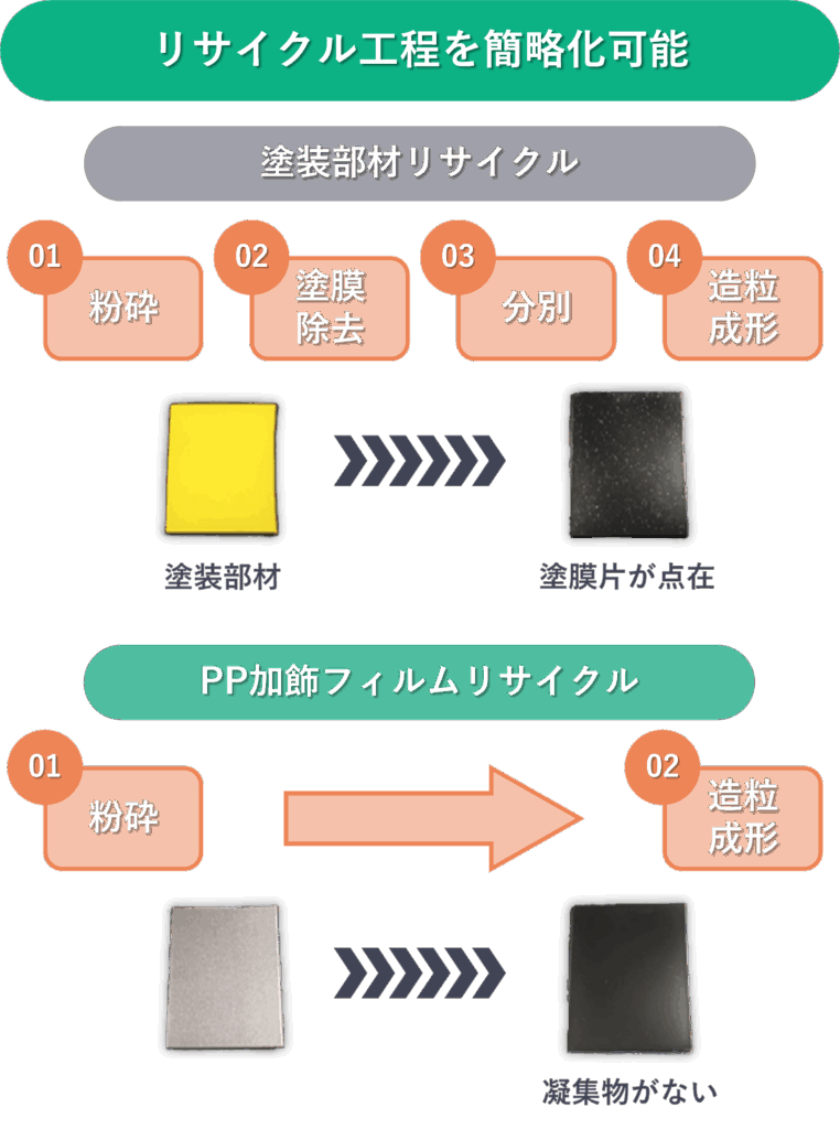 今後生産される自動車部材のモノマテリアル化設計とは別に、既存の塗装部材もリサイクル資源として活用可能です。ただし、物性低下や外観不良の観点から、単純な粉砕品としてのリサイクルは困難です。PP系加飾フィルムを用いることで、リサイクル材使用による外観不良の課題を解決し、物性低下を許容できる部材への再利用に貢献する可能性があります。