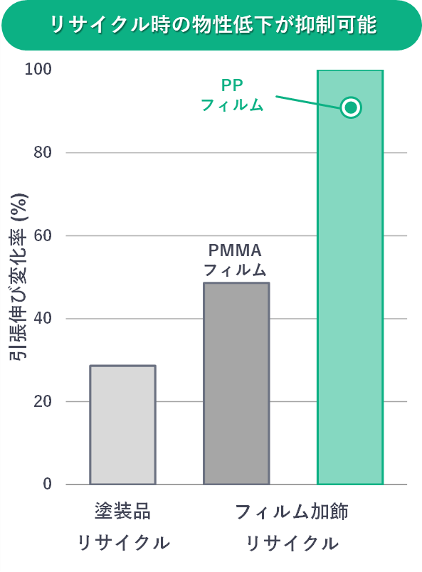 加飾フィルムの PP 化により、加飾部材のモノマテリアル化が可能となり、リサイクル性の向上と環境負荷の低減に寄与することが期待されます。