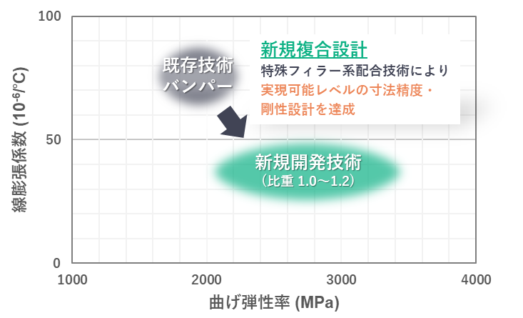 低線膨張性は、外板部材間の隙間を極限まで狭くするために必要な性能であり、高級車では特に鋼板並みの線膨張率が要求されます。鉄、アルミの線膨張率(単位:10⁻⁶/℃)はそれぞれ約 10、30 であるのに対し、標準的な PP は 100 以上、バンパー用 PP でも 70 程度と、アルミとは 2 倍以上の性能差があります。