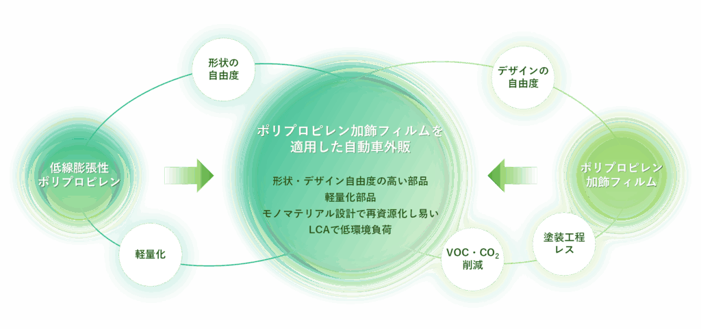 樹脂製外板は、自動車の軽量化による燃費向上を目的として開発・検討されており、欧米車に続き日本車への搭載事例も増えてきています。中でも、PP 製外板はバックドアアウタパネルへの搭載から始まり、最新の軽自動車ではフェンダーやボンネットへの搭載も見られるようになってきました。PP は最も比重の小さい樹脂で成形性に優れることから、軽量化だけでなくデザイン性の観点からも期待されており、外板部材の重要な要求品質である低線膨張性と高剛性(高曲げ弾性率)への取り組みが進められています。