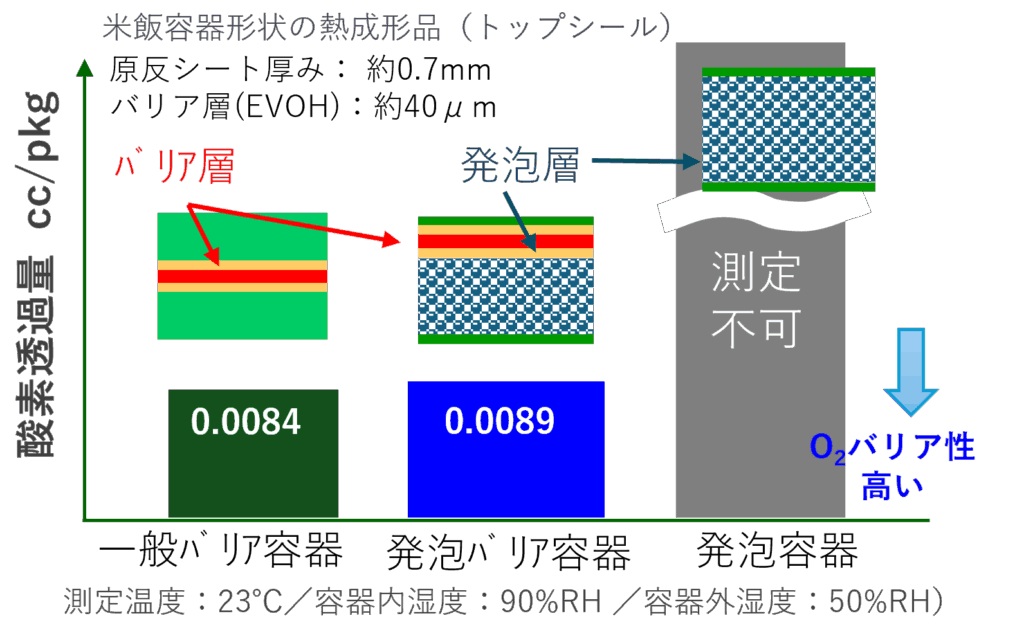 以上のことから、発泡バリア容器は、従来のバリア容器と同等の酸素バリア性を有しながら、軽量・断熱という機能も併せ持つ容器となっていることが分かります。