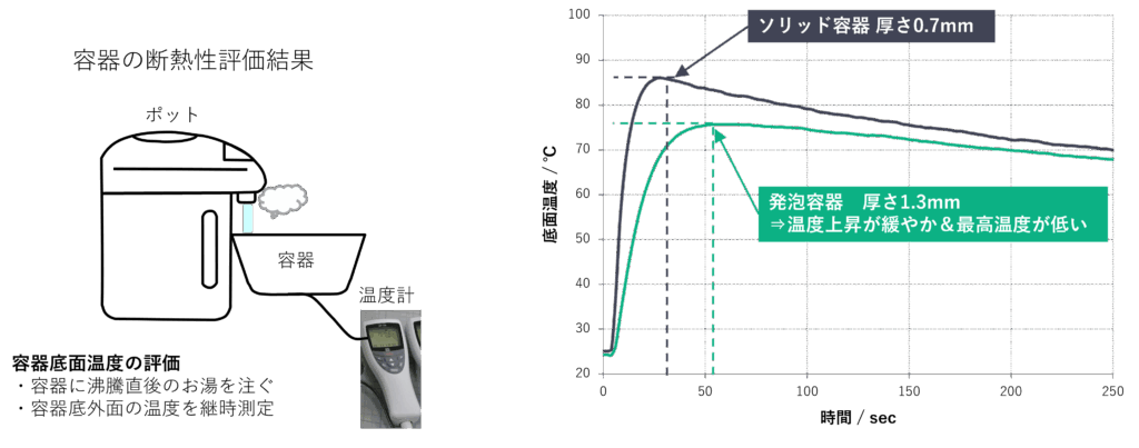 下記には、同形状の PP 発泡容器と PP ソリッド容器のそれぞれに沸騰直後のお湯を注ぎ、容器底面の温度を継時測定した実験結果を示します。ここで使用した発泡 PP 容器は発泡倍率が 3 倍、底面厚みが 1.3mm であり、ソリッド容器より軽いものを用いました。