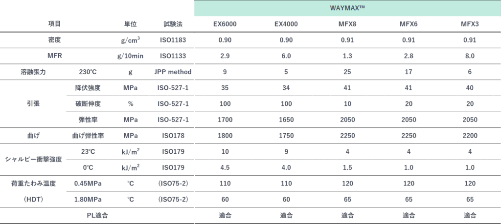 最後に、押出発泡に適する高溶融張力 PP 「WAYMAX™」の一般物性表をご紹介します。