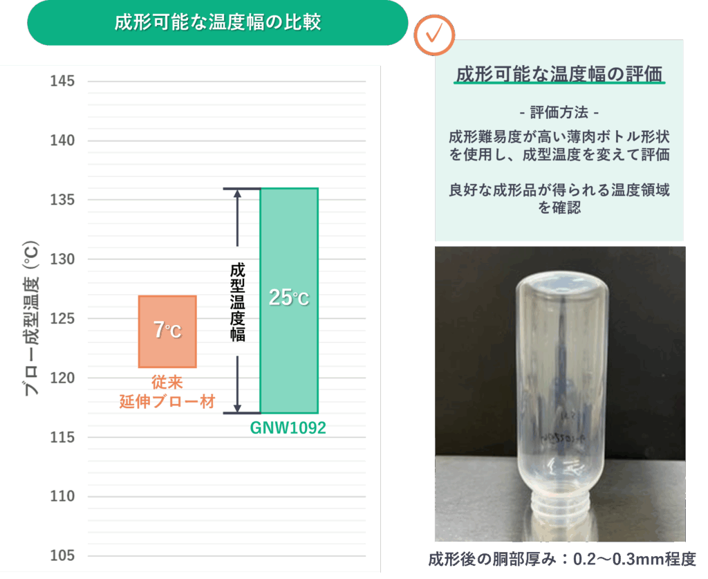 下図の比較結果に示すように、従来の延伸ブロー用PPでは7℃だった成形温度幅が、GNW1092では25℃となり、幅広い温度領域で安定した成形品が得られます。