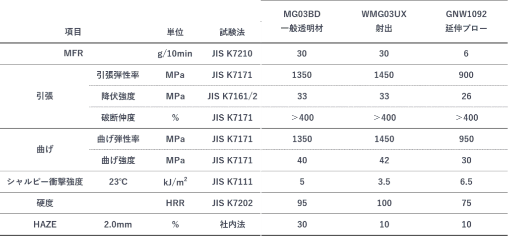 この特性により、化粧品容器や食品用ボトルなど、意匠性と機能性が求められる延伸ブロー用途でPETなどの透明樹脂からの置き換えが期待されます。