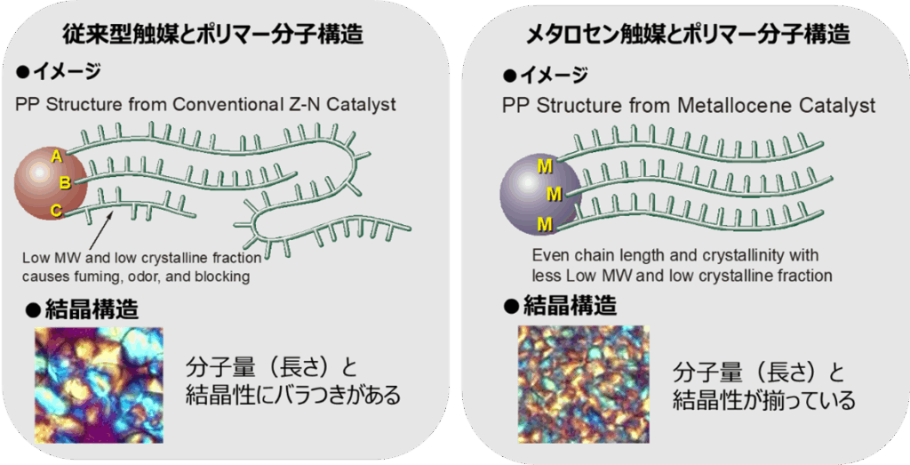 メタロセンPPは、従来のZ-N触媒で製造したPPよりも均一な分子量分布と結晶性を有していることが分かります。