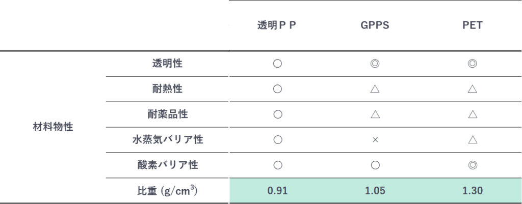 下表は、高透明PP・GPPS・PETの材料特性を比較したものです。PPは耐熱性・耐薬品性・バリア性といった材料特性に優れているだけでなく、比重が低く(約0.90~0.91)で、軽量な製品設計が可能です。この軽量性は輸送効率や使用時のエネルギー効率を高め、ライフサイクル全体での環境負荷低減に貢献します。さらに、PPは汎用プラスチックの中でも製造時の温室効果ガス(GHG)排出量が少ないという利点があります※。