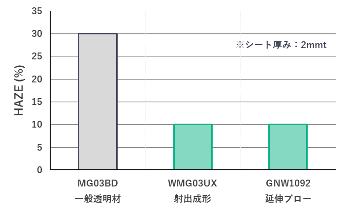 下図には、従来PPであるMG03BDとウィンテック™ WMG03UX/GNW1092の透明性比較(HAZE)結果を示しています。