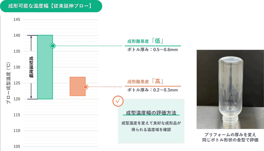 一般的にPPは延伸ブローが難しい材料です。成形難易度が低い形状(単純形状・厚肉など)であれば、PPでも比較的広い温度範囲で成形が可能ですが、成形難易度が高い形状(複雑・薄肉など)では、成形可能な温度幅が非常に狭く、安定した成形品を得ることが難しいという課題がありました。