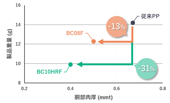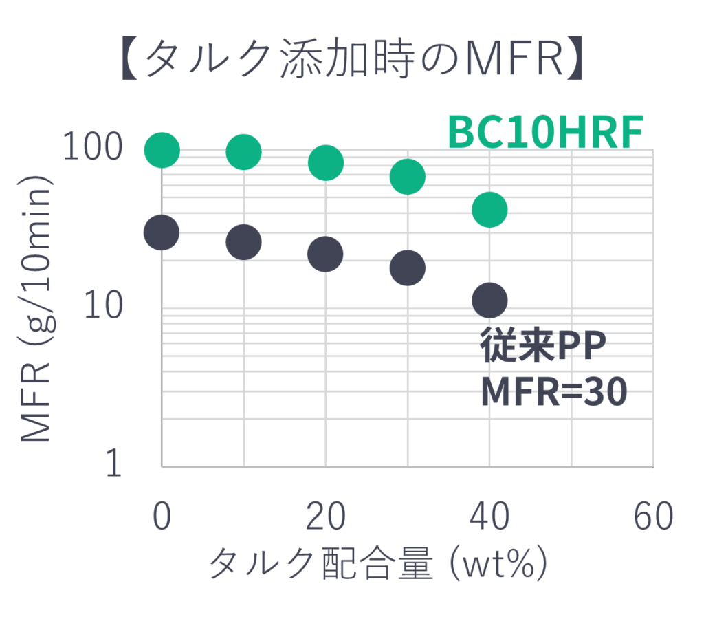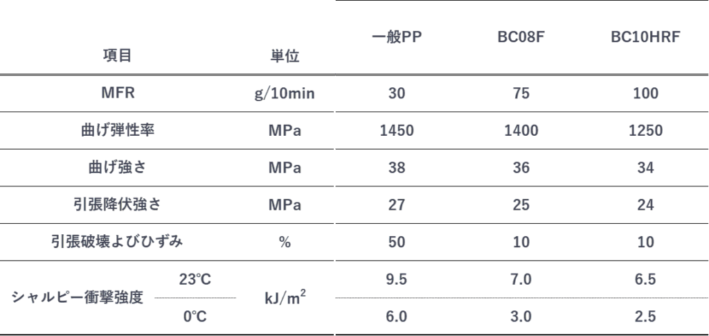 上記の課題に対応するため、流動性と機械的特性のバランスを両立したポリプロピレン樹脂(PP)であるノバテックBC08F/BC10HRFを開発しました。