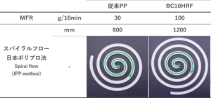 流動性の比較として、従来PP(MFR = 30g/10min)とBC10HRFのスパイラルフロー評価結果を下図に示します。