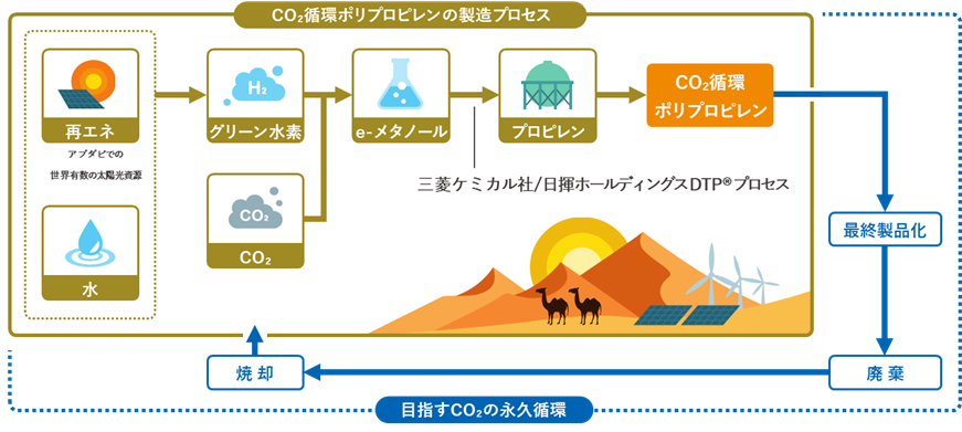 二酸化炭素とグリーン水素を原料として製造されたeーメタノールは、日揮グローバル株式会社と三菱ケミカル株式会社が共同で保有する「DTP®プロセス」によってプロピレンへ変換することが可能です。この技術により、二酸化炭素とグリーン水素を原料としたポリプロピレンの製造が可能となりました。