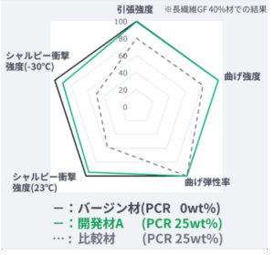 ファンクスター™においても、マテリアルリサイクル材は原料由来の異物などの影響により、バージン材と比べて物性が劣る課題があります。