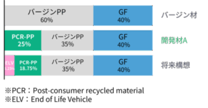 下表に示す通り、自動車用途の各種部品(バンパー、インパネ、ドアトリム等)を想定した材料の設計、開発が可能であり、これらの材料は自動車工業会の公表した各種部品の目標値も満足しています。